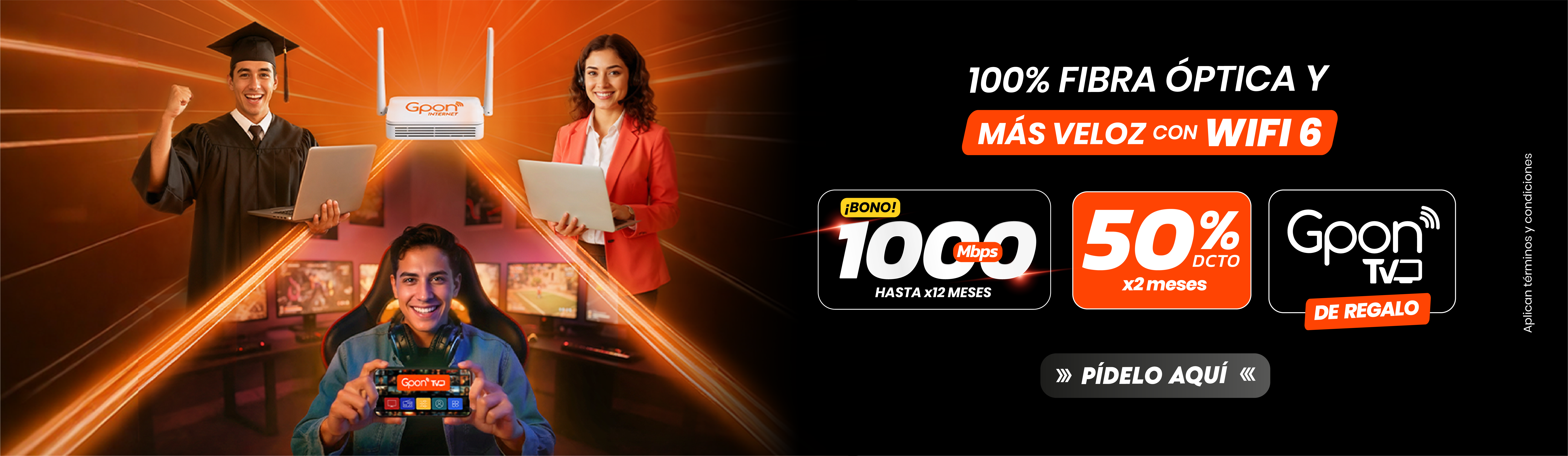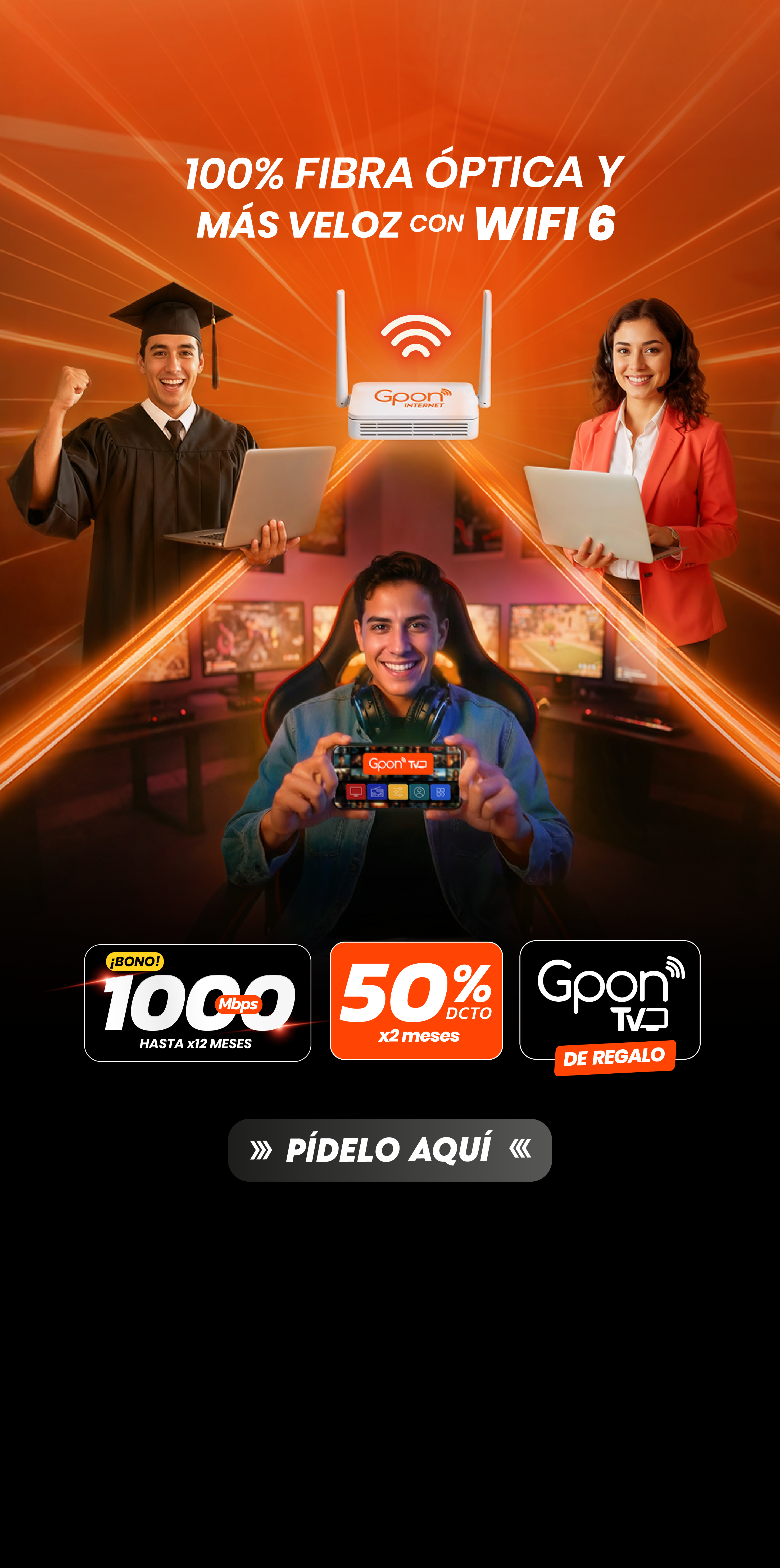 Precios incluyen IGV. (1) Promoción 50% de descuento aplica en todos los planes por los dos primeros meses, el tercer mes se pagará el precio regular del plan adquirido. Promoción válida del 01/11/2025 al 30/11/2025. No acumulable con otras promociones. Válido solo para clientes nuevos. (2) Bono de 1000 Mbps aplica en el plan de 300 Mbps por 6 meses y en el plan de 600 Mbps por 12 meses. (3) Instalación gratis sujeta a cobertura, factibilidad técnica y evaluación crediticia. Garantizamos el 70% de la velocidad contratada. Todos nuestros planes tienen un contrato con permanencia mínima de 6 meses de acuerdo a las normas establecidas por OSIPTEL. (4) Gpon TV de regalo en todos los planes, disponible en televisores con sistemas Android TV y Samsung de fabricación 2021 en adelante, cuenta con canales nacionales e internacionales y puede usarse en hasta 3 dispositivos simultáneamente. (5) Gpon TV Móvil disponible en celulares Android. (6) Plan de 1000 Mbps con costo 149 soles en precio regular incluye Repetidor wifi 6. Plan de 1000 Mbps con costo de 189 soles en precio regular incluye Repetidor wifi 7. (7) Canales Liga1 y Liga1 MAX está incluido en planes seleccionados. Sujeto a permanencia mínimo de 6 meses. (8) Planes DGO con costo adicional al plan.