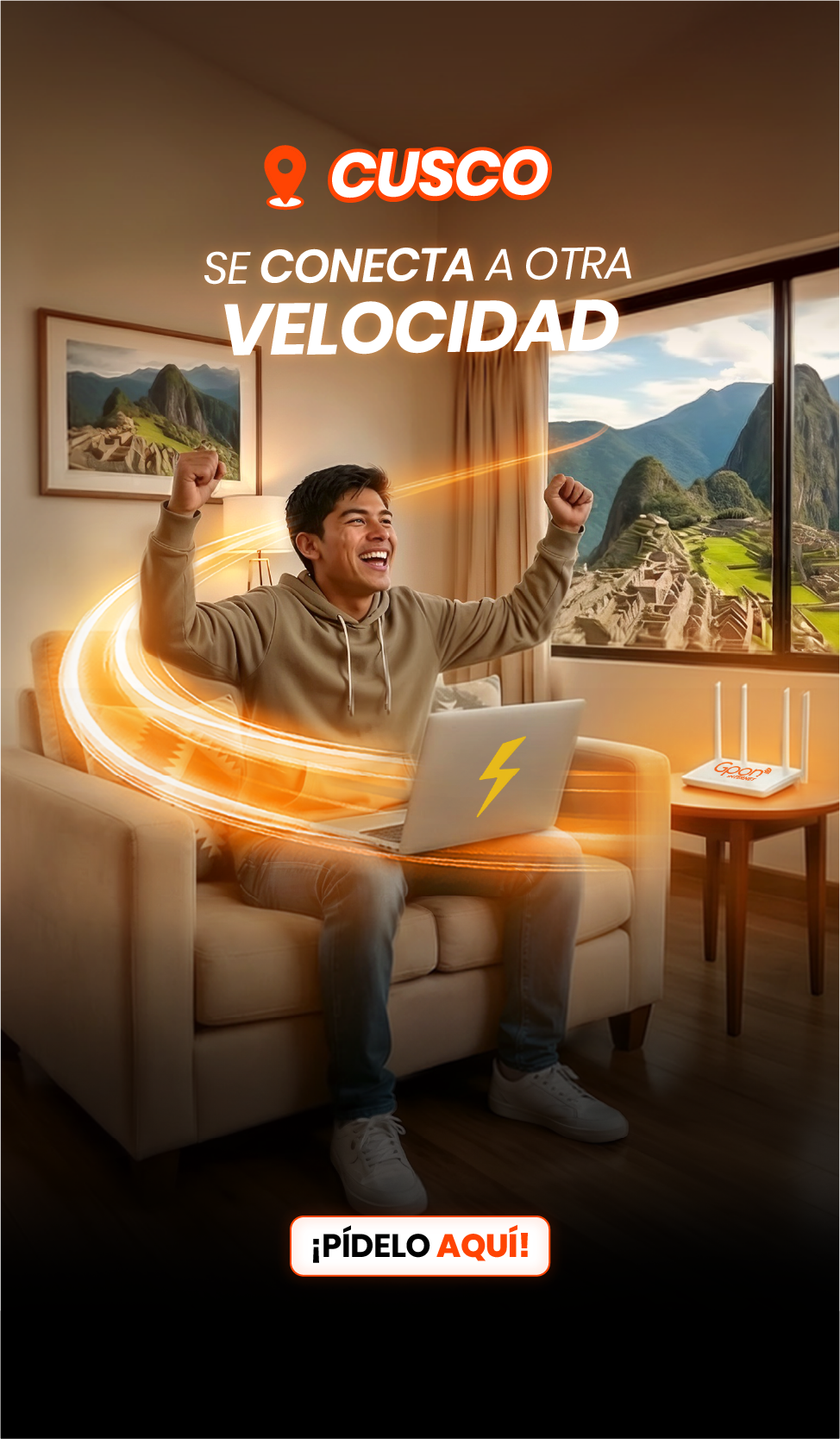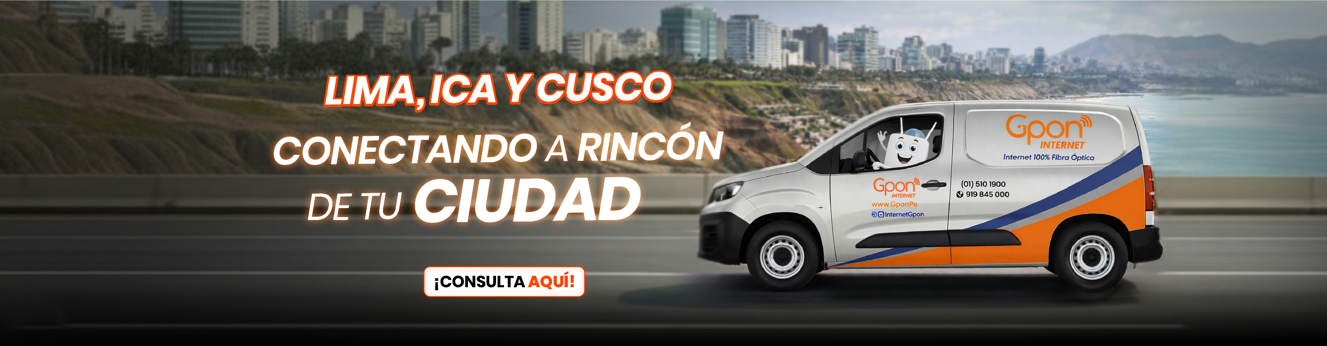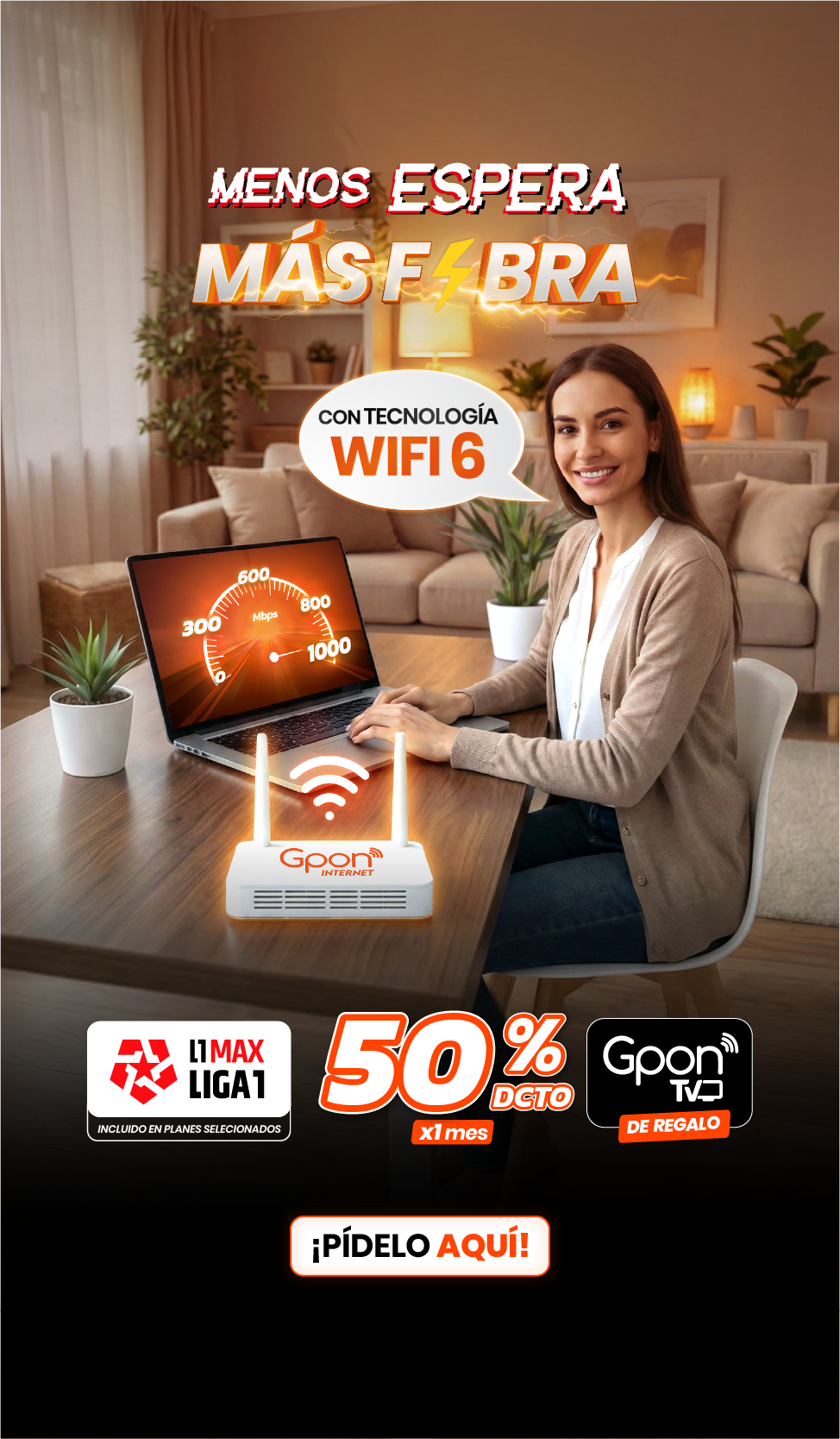 Precios incluyen IGV. (1) Promoción 50% de descuento aplica en todos los planes por el primer mes, el segundo mes se pagará el precio regular del plan adquirido. Promoción válida del 01/04/2026 al 30/04/2026. No acumulable con otras promociones. Válido solo para clientes nuevos. (2) Plan de 200 Mbps duplica a 400 Mbps por los seis primeros meses. (3) Instalación gratis sujeta a cobertura, factibilidad técnica y evaluación crediticia. Garantizamos el 70% de la velocidad contratada. Todos nuestros planes tienen un contrato con permanencia mínima de 6 meses de acuerdo a las normas establecidas por OSIPTEL. (4) Gpon TV de regalo en todos los planes, disponible en televisores con sistemas Android TV y Samsung de fabricación 2021 en adelante, cuenta con canales nacionales e internacionales y puede usarse en hasta 3 dispositivos simultáneamente. (5) Gpon TV Móvil disponible en celulares Android. (6) Canales Liga 1 y Liga 1 MAX están incluidos en planes seleccionados. Sujeto a permanencia mínima de 6 meses. (7) Planes DGO con costo adicional al plan.