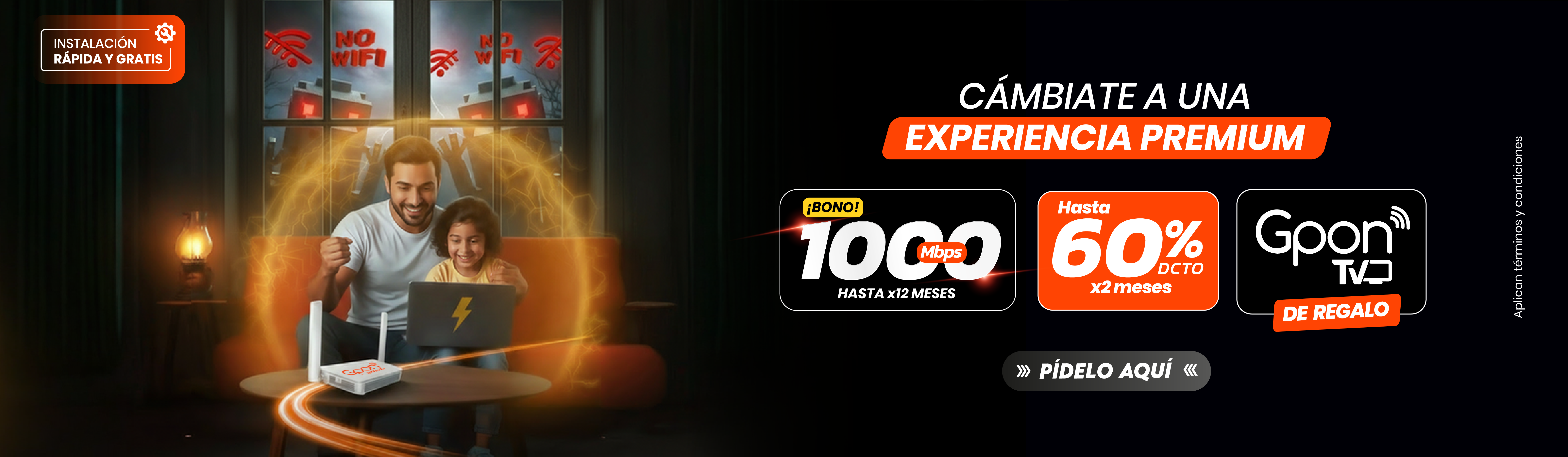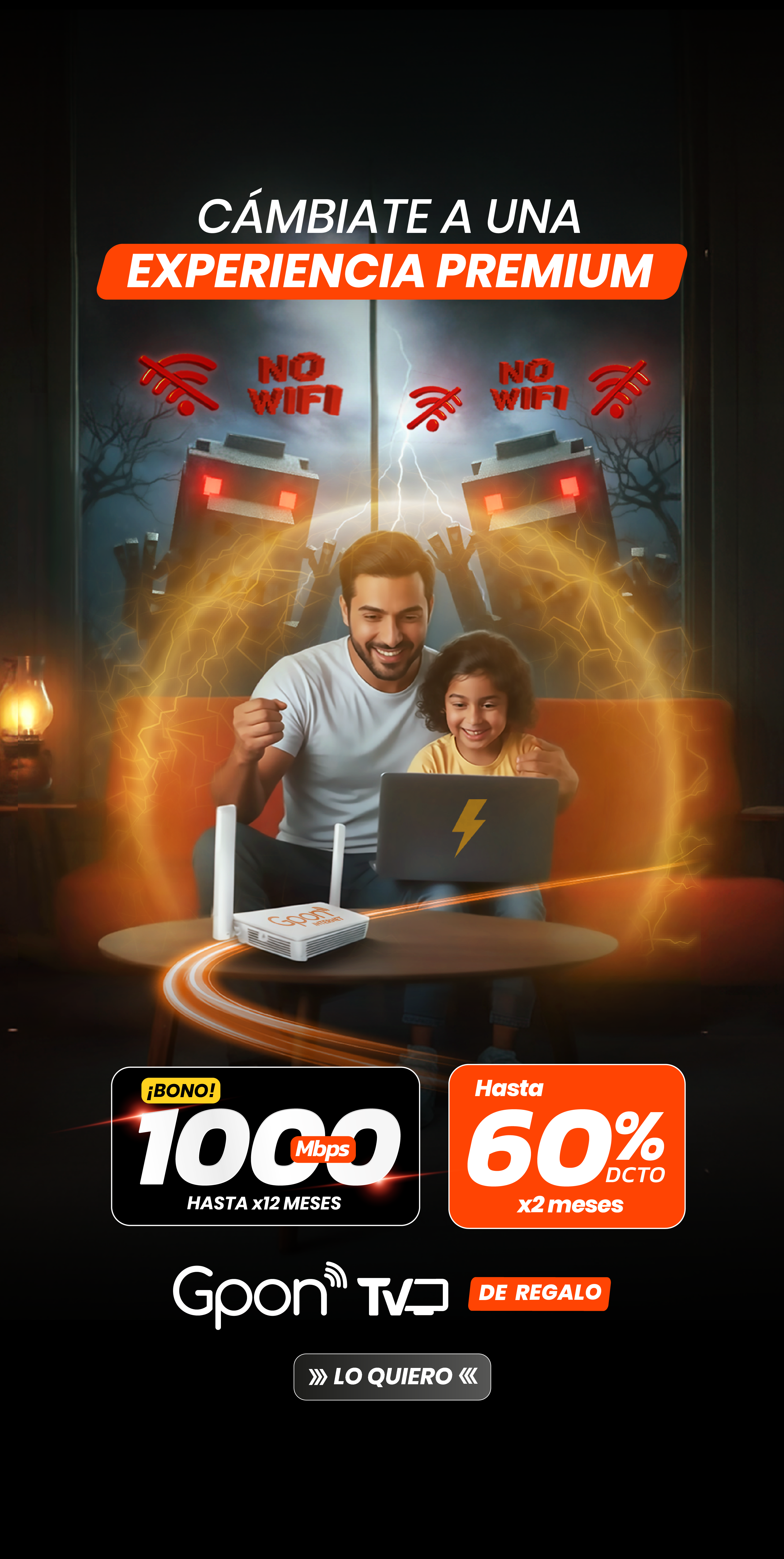Precios incluyen IGV. (1) Promoción 50% de descuento aplica en planes de 300 Mbps y 1000 Mbps por los dos primeros meses, el tercer mes se pagará el precio regular del plan. (2) Promoción 60% de descuento aplica en plan de 600 Mbps por dos meses, el tercer mes se pagará el precio regular del plan. Promoción válida del 01/10/2025 al 31/10/2025. No acumulable con otras promociones. Válido solo para clientes nuevos. (3) Bono de 1000 Mbps aplica en los planes de 300 Mbps por 6 meses y en el plan de 600 Mbps por 12 meses. (4) Instalación gratis sujeta a cobertura, factibilidad técnica y evaluación crediticia. Garantizamos el 70% de la velocidad contratada. Todos nuestros planes tienen un contrato con permanencia mínima de 6 meses de acuerdo a las normas establecidas por OSIPTEL. (5) Gpon TV de regalo en todos los planes, disponible en televisores con sistemas Android TV y Samsung de fabricación 2021 en adelante, cuenta con canales nacionales e internacionales y puede usarse en hasta 3 televisores simultáneamente. (6) Gpon Tv Móvil disponible en celulares Android. (7) Plan de 1000 Mbps con costo 149 soles en precio regular incluye Repetidor wifi 6. Plan de 1000 Mbps con costo de 189 soles en precio regular incluye Repetidor wifi 7. (8) Canales Liga 1 y Liga 1 MAX está incluido en planes seleccionados. Sujeto a permanencia mínimo de 6 meses. (9) Planes DGO con costo adicional al plan.