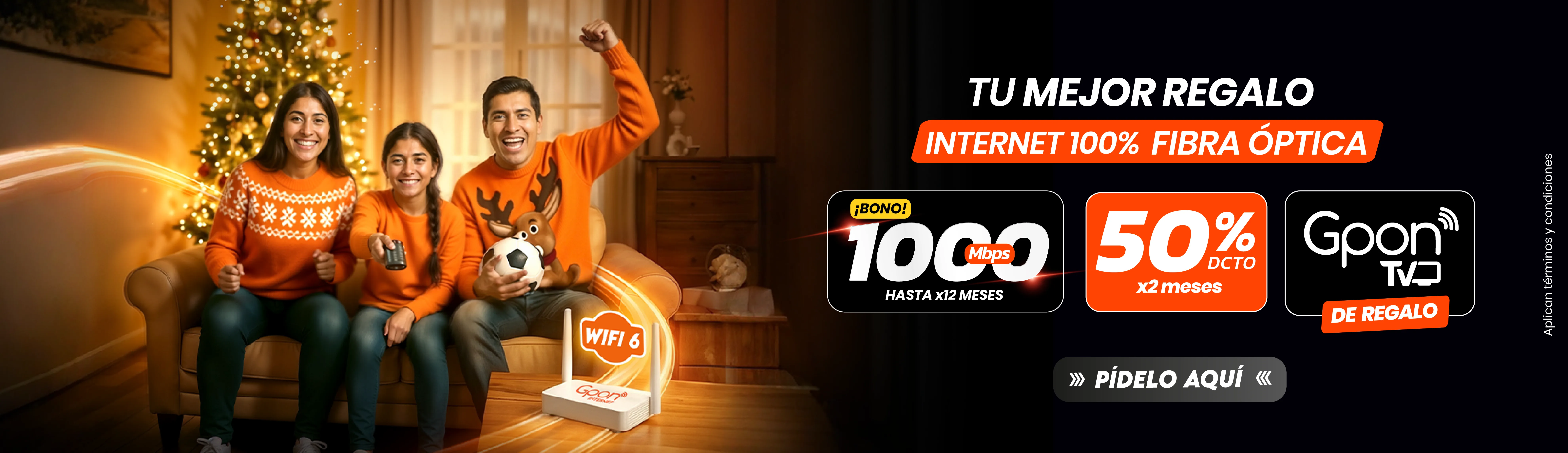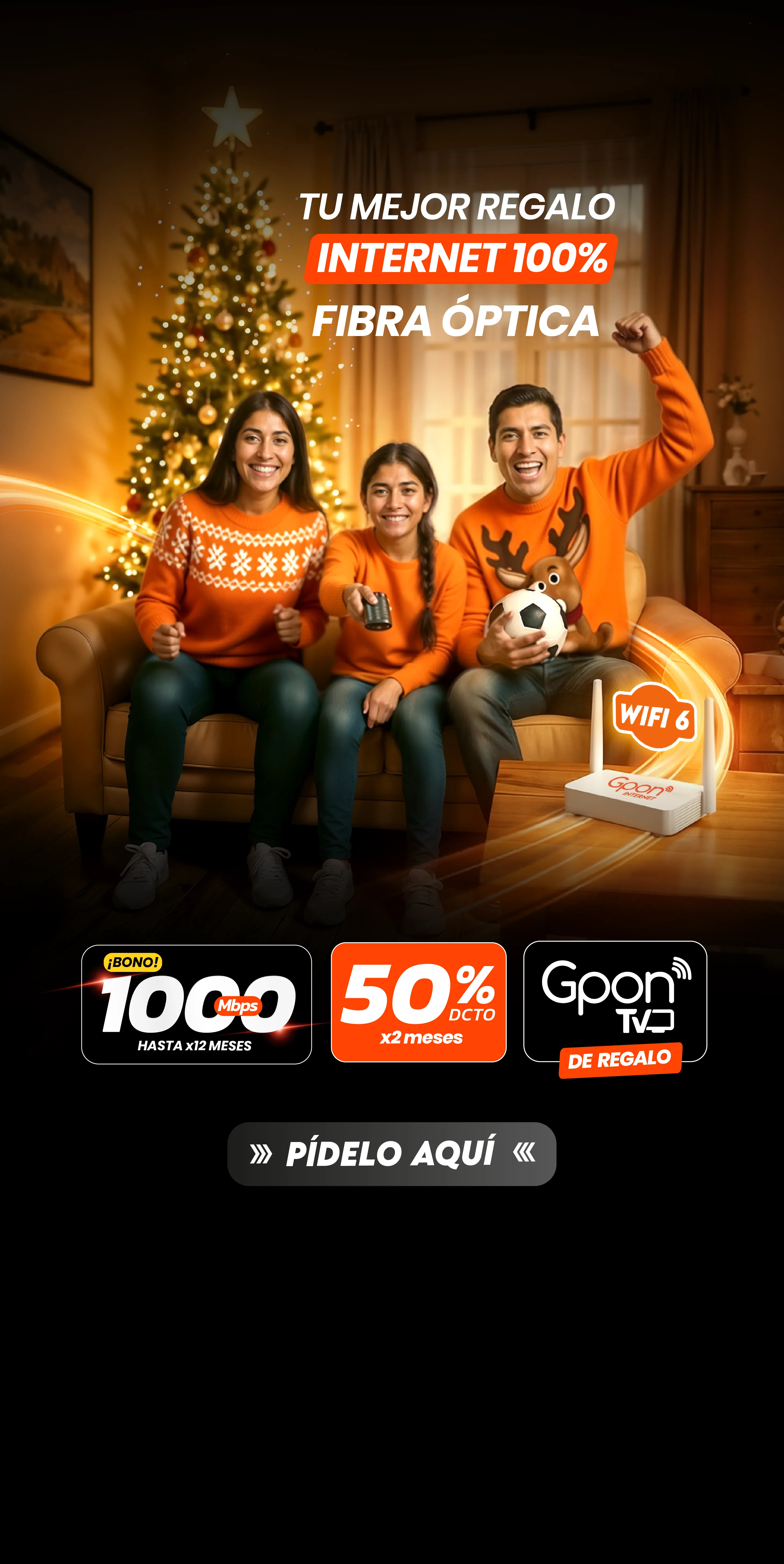 Precios incluyen IGV. (1) Promoción 50% de descuento aplica en todos los planes por los dos primeros meses, el tercer mes se pagará el precio regular del plan adquirido. Promoción válida del 01/12/2025 al 31/12/2025. No acumulable con otras promociones. Válido solo para clientes nuevos. (2) Bono de 1000 Mbps aplica en el plan de 300 Mbps por 6 meses y en el plan de 600 Mbps por 12 meses. (3) Instalación gratis sujeta a cobertura, factibilidad técnica y evaluación crediticia. Garantizamos el 70% de la velocidad contratada. Todos nuestros planes tienen un contrato con permanencia mínima de 6 meses de acuerdo a las normas establecidas por OSIPTEL. (4) Gpon TV de regalo en todos los planes, disponible en televisores con sistemas Android TV y Samsung de fabricación 2021 en adelante, cuenta con canales nacionales e internacionales y puede usarse en hasta 3 dispositivos simultáneamente. (5) Gpon TV Móvil disponible en celulares Android. (6) Plan de 1000 Mbps con costo 149 soles en precio regular incluye Repetidor wifi 6. Plan de 1000 Mbps con costo de 189 soles en precio regular incluye Repetidor wifi 7. (7) Canales Liga1 y Liga1 MAX está incluido en planes seleccionados. Sujeto a permanencia mínimo de 6 meses. (8) Planes DGO con costo adicional al plan.