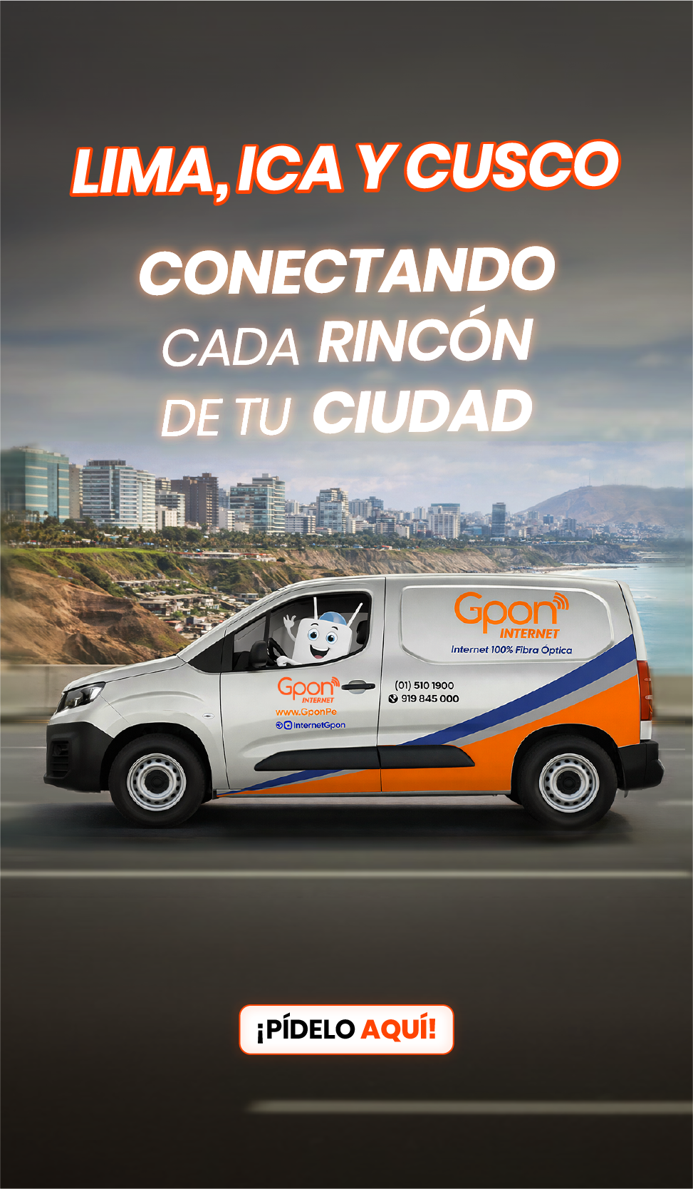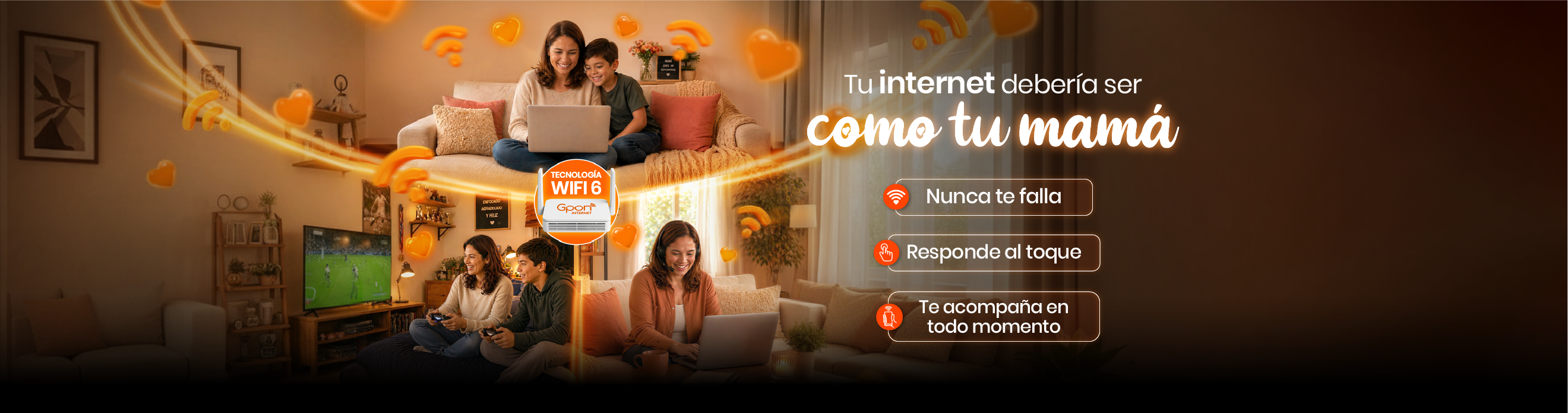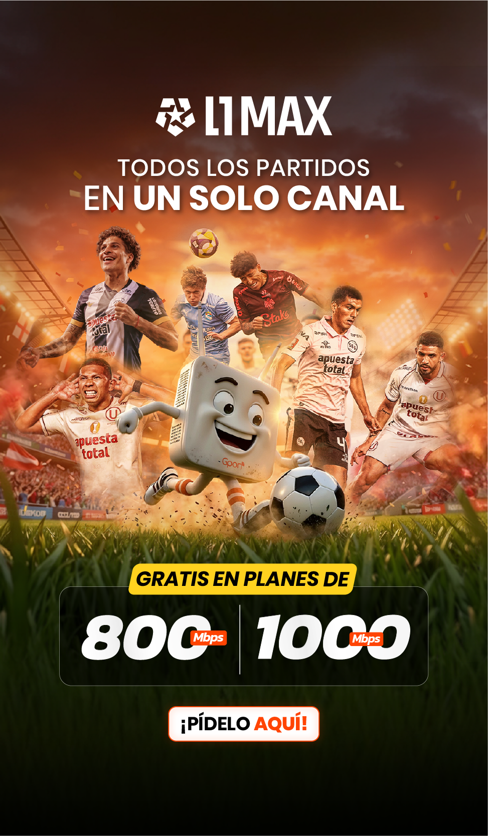 Precios incluyen IGV. (1) Promoción 50% de descuento aplica en todos los planes por el primer mes, el segundo mes se pagará el precio regular del plan adquirido. Promoción válida del 01/04/2026 al 30/04/2026. No acumulable con otras promociones. Válido solo para clientes nuevos. (2) Plan de 200 Mbps duplica a 400 Mbps por los seis primeros meses. (3) Instalación gratis sujeta a cobertura, factibilidad técnica y evaluación crediticia. Garantizamos el 70% de la velocidad contratada. Todos nuestros planes tienen un contrato con permanencia mínima de 6 meses de acuerdo a las normas establecidas por OSIPTEL. (4) Gpon TV de regalo en todos los planes, disponible en televisores con sistemas Android TV y Samsung de fabricación 2021 en adelante, cuenta con canales nacionales e internacionales y puede usarse en hasta 3 dispositivos simultáneamente. (5) Gpon TV Móvil disponible en celulares Android. (6) Canales Liga 1 y Liga 1 MAX están incluidos en planes seleccionados. Sujeto a permanencia mínima de 6 meses. (7) Planes DGO con costo adicional al plan.